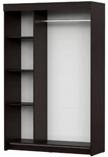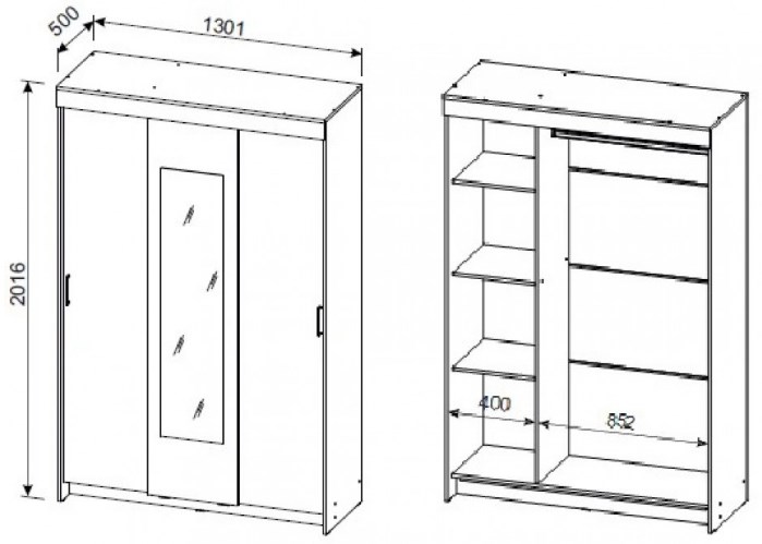 Шкаф разделен вертикальной перегородкой на два отделения. Справа платяное отделение шириной 852 мм, слева бельевое - шириной 400 мм. Платяное отделение комплектуется металлической штангой, бельевое - тремя полками