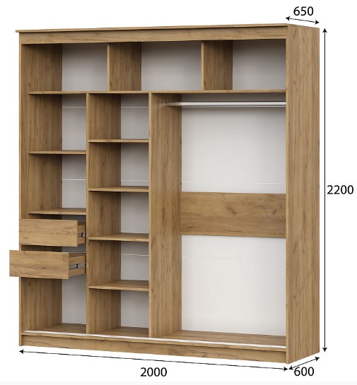 Шкаф разделен вертикальной перегородкой на два отделения. Справа платяное отделение укомплектовано металлической штангой, слева бельевое – полками и двумя ящиками